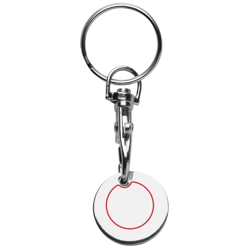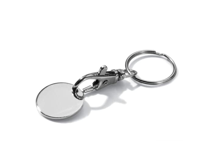 Metalen winkelwagenmuntje met karabijnhaak en sleutelhanger ring. Eenvoudig aan de sleutelbos te bevestigen. Geschikt voor karretjes met €0,50 en €1,00. Perfect voor winkelwagenmuntjes bedrukken.