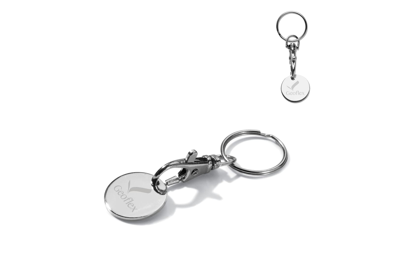 Metalen winkelwagenmuntje met karabijnhaak en sleutelhanger ring. Eenvoudig aan de sleutelbos te bevestigen. Geschikt voor karretjes met €0,50 en €1,00. Perfect voor winkelwagenmuntjes bedrukken.