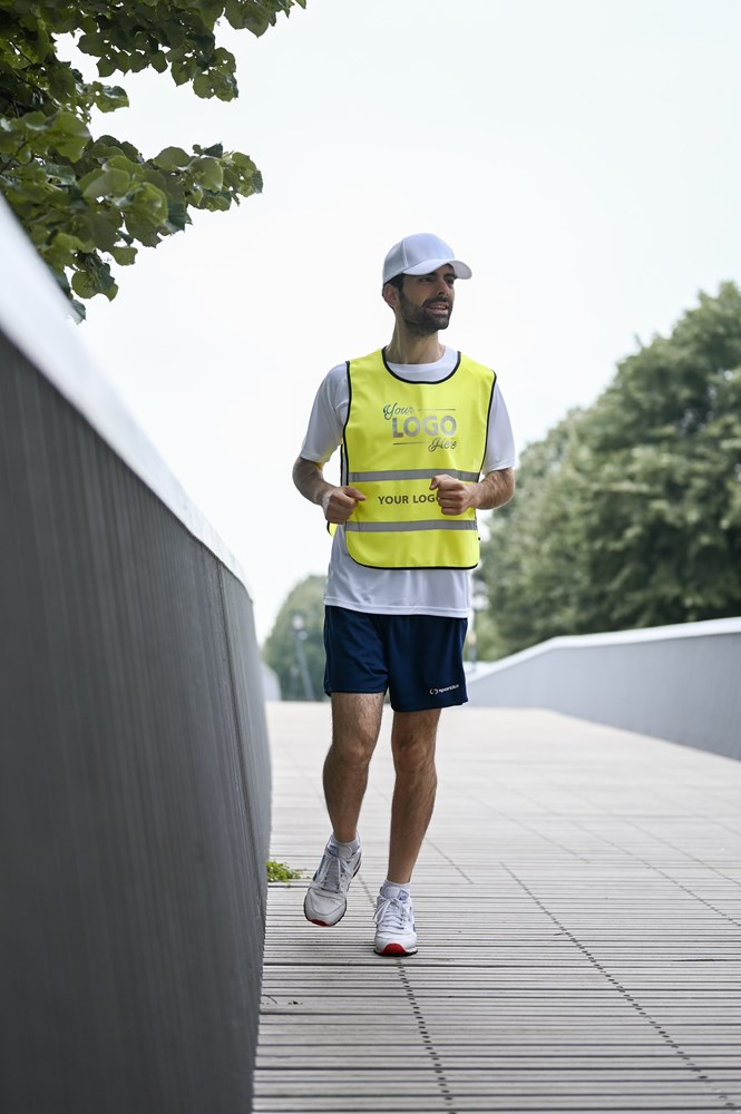 Voor nachtelijke trainingssessies en hardlooprondes. Zorg dat je opvalt in het donker en draag dit training safety jacket over je sportkleding. Verkrijgbaar in één maat (XL), maar op maat te maken met de koortjes aan de zijkanten.