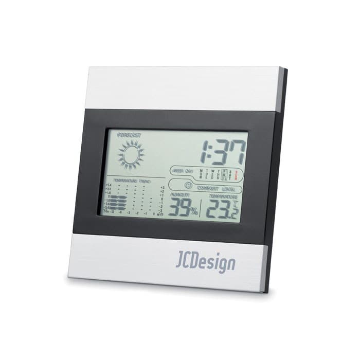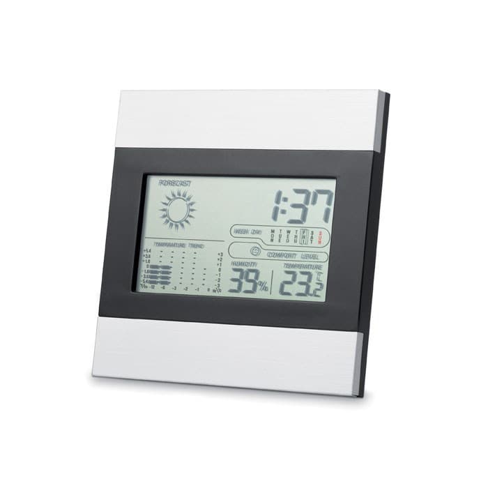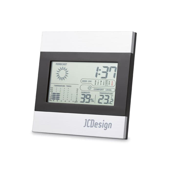 Stijlvol zwart/zilver weerstation met geïntegreerde klok, temperatuurmeter, luchtvochtigheidweergave en kalender. Perfect voor klokken bedrukken met een logo of boodschap. Exclusief 2x AAA batterijen.