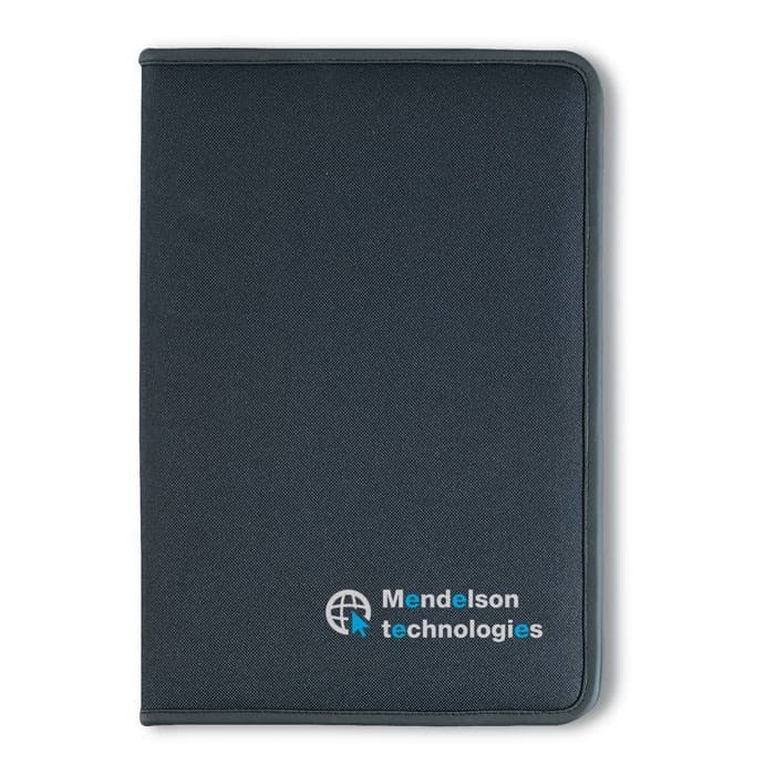 A4 schrijfmap met rits, 4 vakken en visitekaarthouder. Inclusief schrijfblok met 20 vel. 600D polyester en 210T lining.