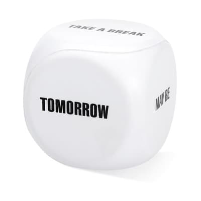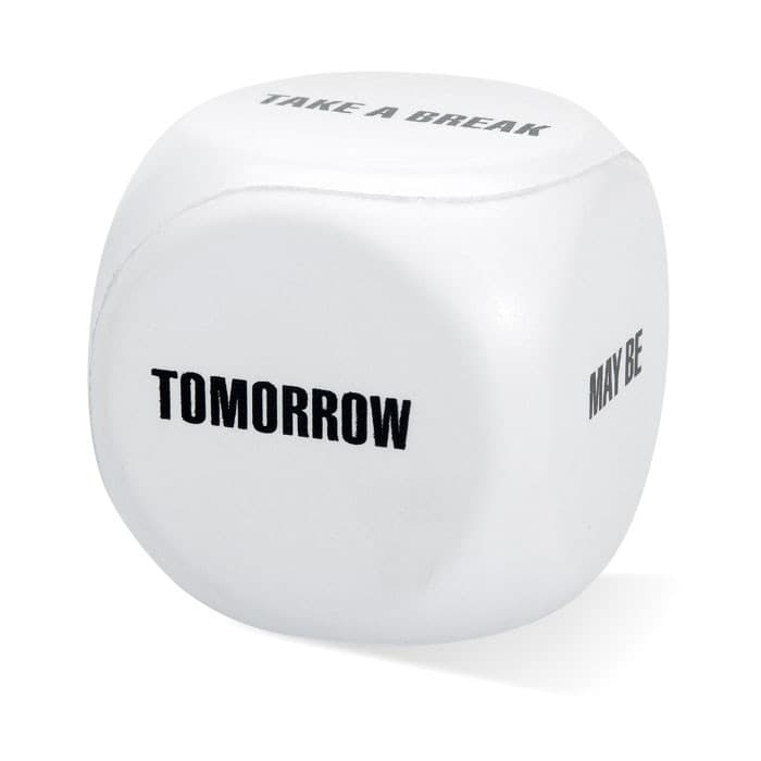 Anti-stress dobbelsteen 'decision maker' (TAKE A BREAK, TOMORROW, MAY BE, YES, NO) van PU. Perfect voor stressballen bedrukken.