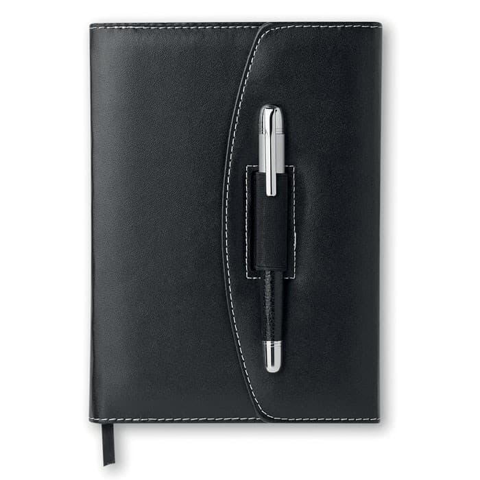 Schrijfmap van A5 formaat met contrasterende stiksels, inclusief 240 pagina's (120 vellen) gelinieerd papier en een metalen pen. PU materiaal. Zwarte inkt.