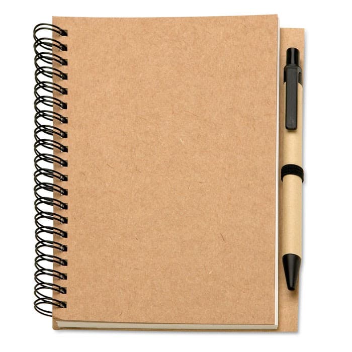 Schrijfblok met 140 blanco pagina's (70 vellen) gerecycled papier, inclusief biologisch afbreekbare en gerecyclede balpen. Blauwe inkt.