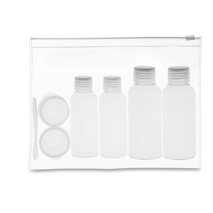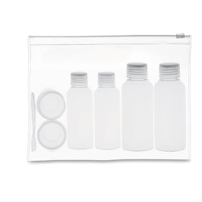 Vliegtuig reissetje. Transparant tasje voor in uw handbagage met vier lege flesjes en 2 lege potjes. (100ml, 50ml and 10ml)