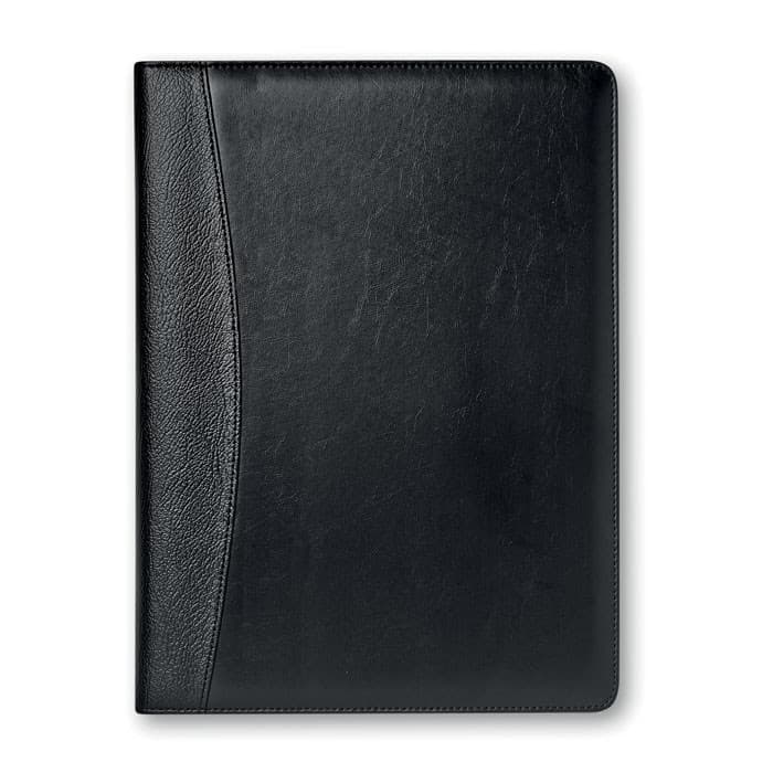 Imitatielederen A4 schrijfmap met rekenmachine op zonne-energie, balpen (blauwe inkt) en schrijfblok.