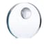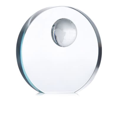 Ronde glazen trofee met wereldbolreliëf. Verpakt in een klassieke geschenkverpakking.