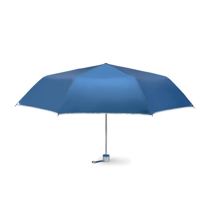 21 Inch paraplu met metalen frame en uiteinde. Zwart metalen baleinen. Panelen in kleur en zilver coating aan de binnenzijde. Kunststof handvat. In 3 delen opvouwbaar. Inclusief bijpassend hoesje. Opent en sluit handmatig.