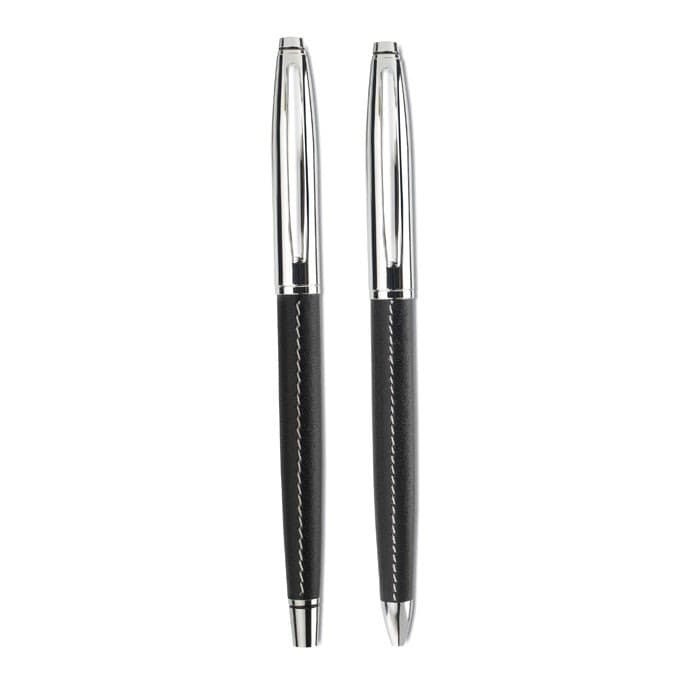Metalen balpen en rollerpen in een PU etui in bijpassende kleur en stiksel. Respectievelijk blauwe en zwarte inkt.