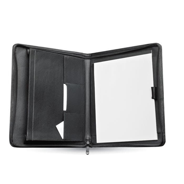 A4 schrijfmap van leer en PU met vakken, een pennenlus en een schrijfblok met 25 vellen blanco papier, sluit met rits.