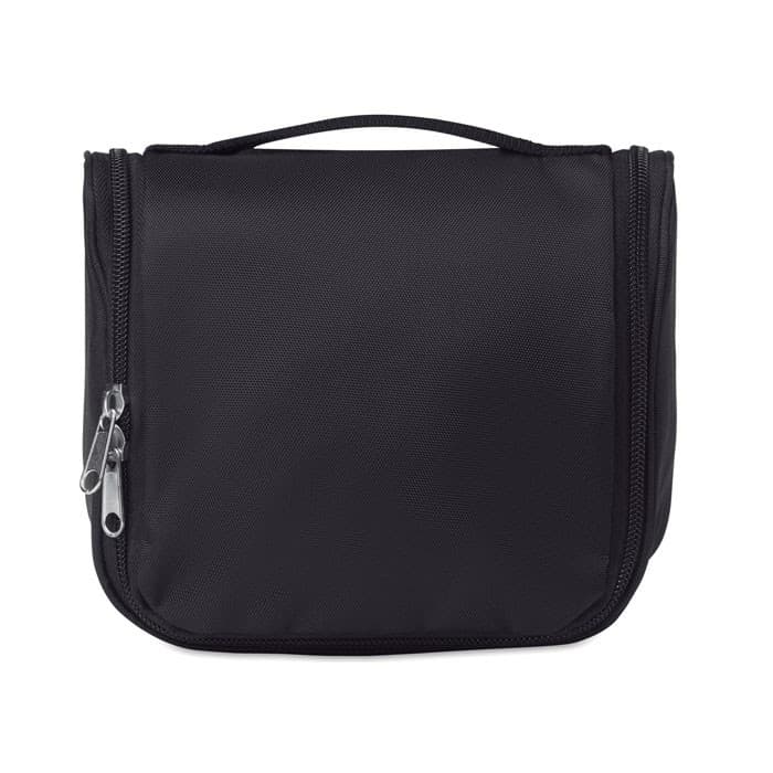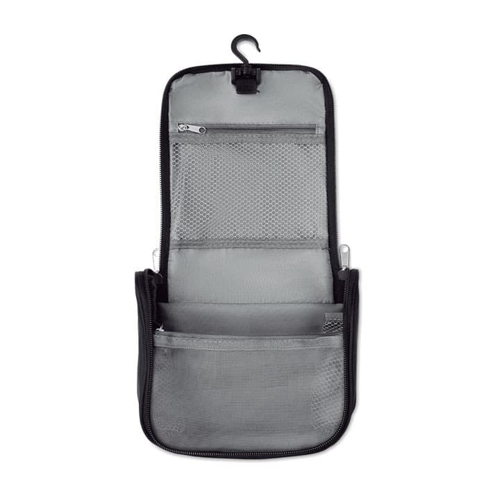 Wil je een toilettas bedrukken die handig is voor onderweg? Deze toilettas heeft een kunststof haak om op te hangen en meerdere vakken voor een overzichtelijke opbergruimte. Perfect voor reizen of kamperen.