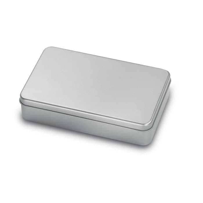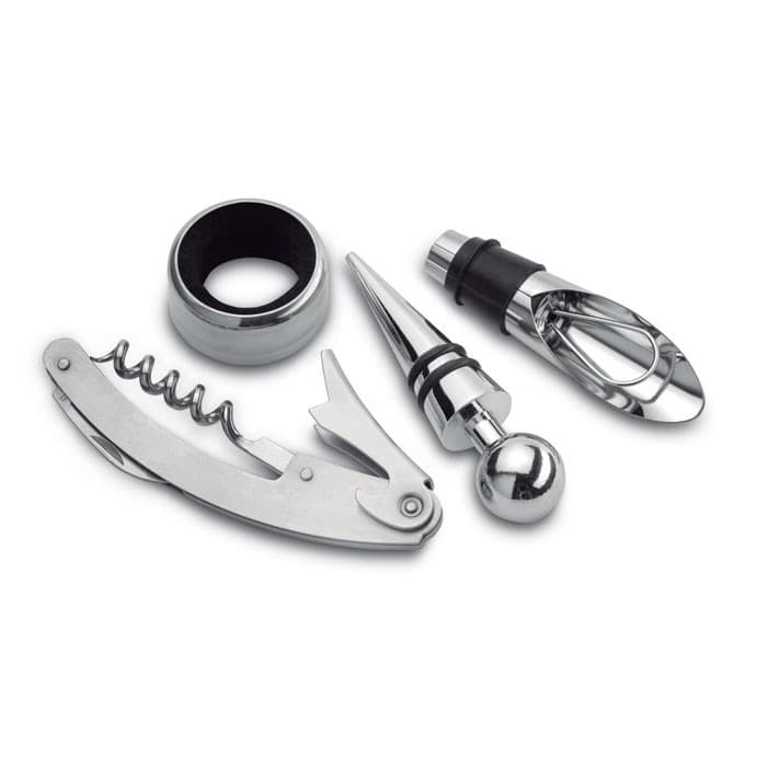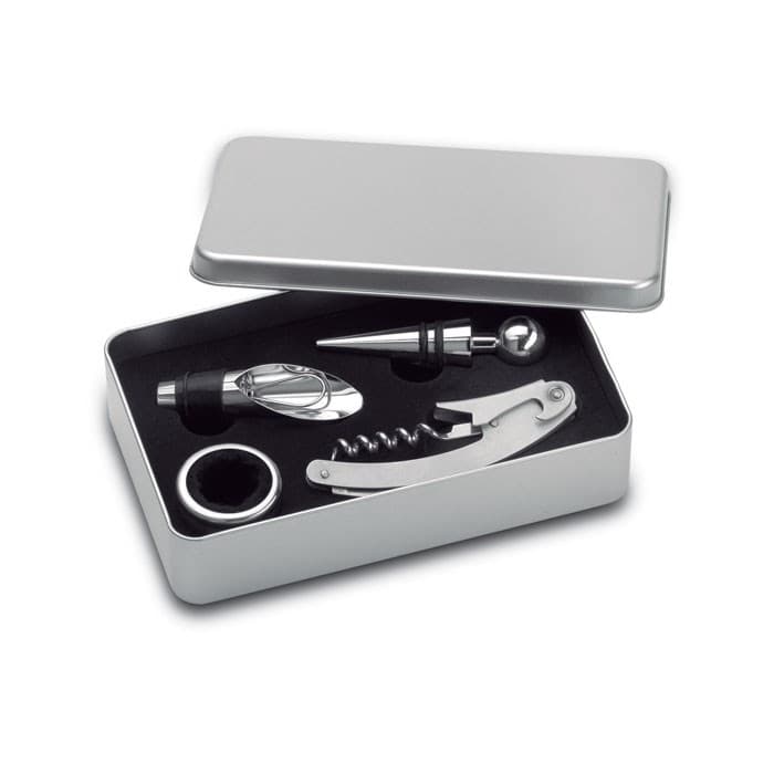 4-Delige wijnaccessoires-set bestaande uit een flessenopener, stop, schenktuit en wijnring. Gepresenteerd in een blikken doosje.