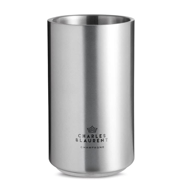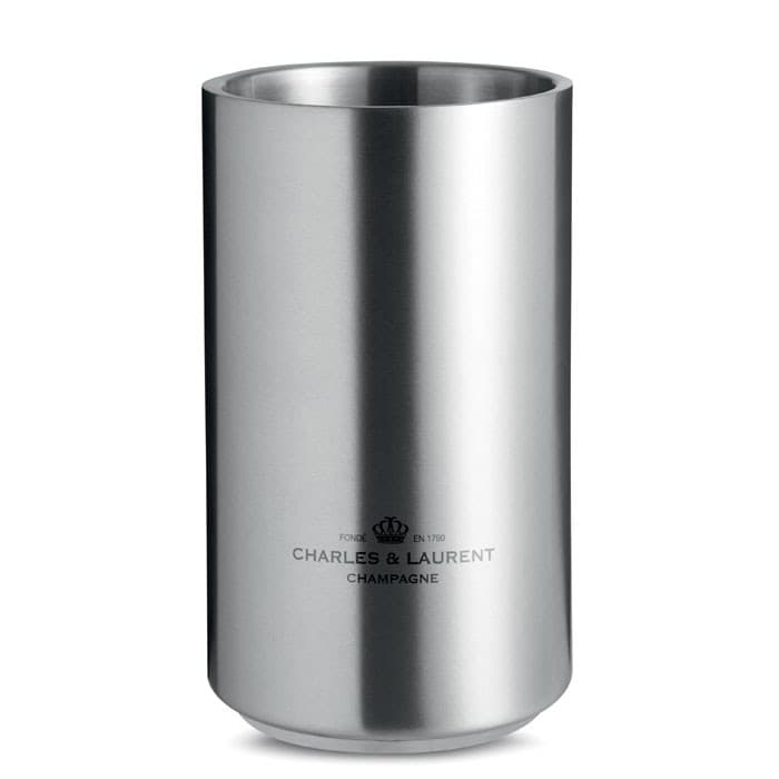 Dubbelwandige ronde flessenkoeler van roestvrijstaal.