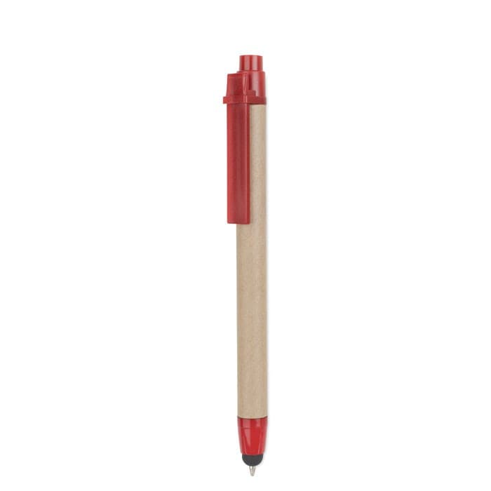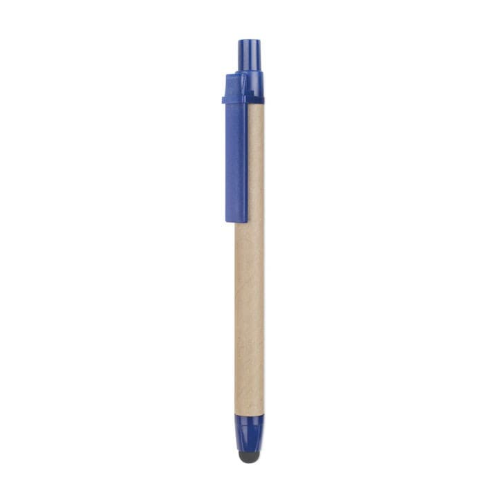Balpen met drukmechanisme en een behuizing gemaakt van gerecycled karton, met een ABS punt en clip. Navulbaar, blauwe inkt en touch pen voor touchscreens.