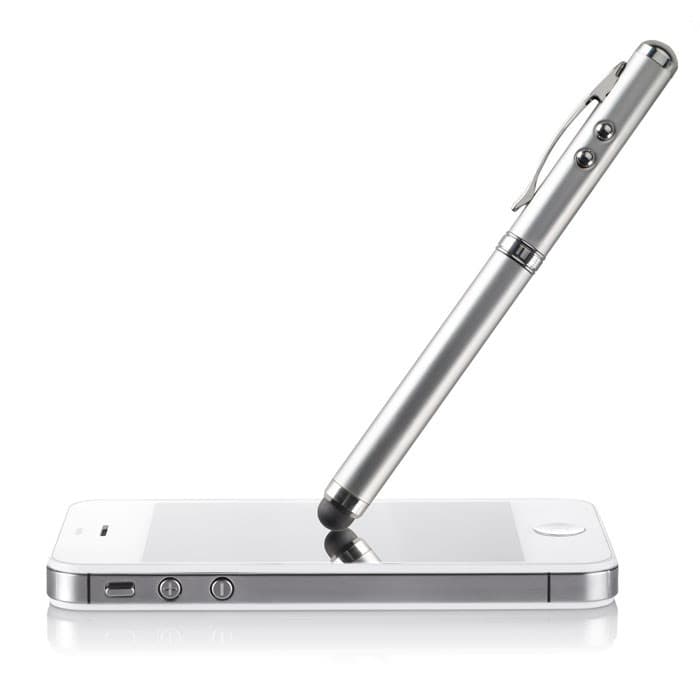 Multifunctionele balpen met zilver gespoten metalen behuizing. Zwarte inkt, wit LED licht, rode laser pointer en touch pen voor touchscreens. Incl. 3 knoopcel batterijen. Geleverd in bijpassend metalen doosje.
