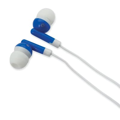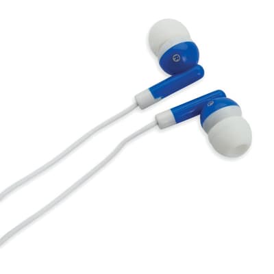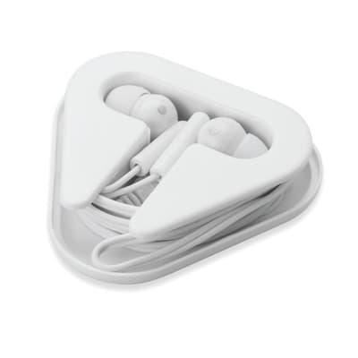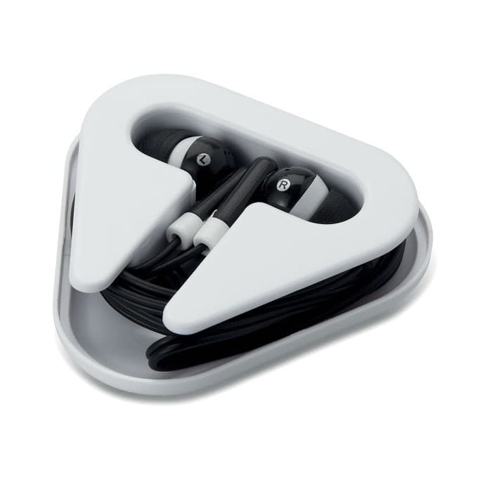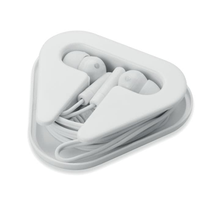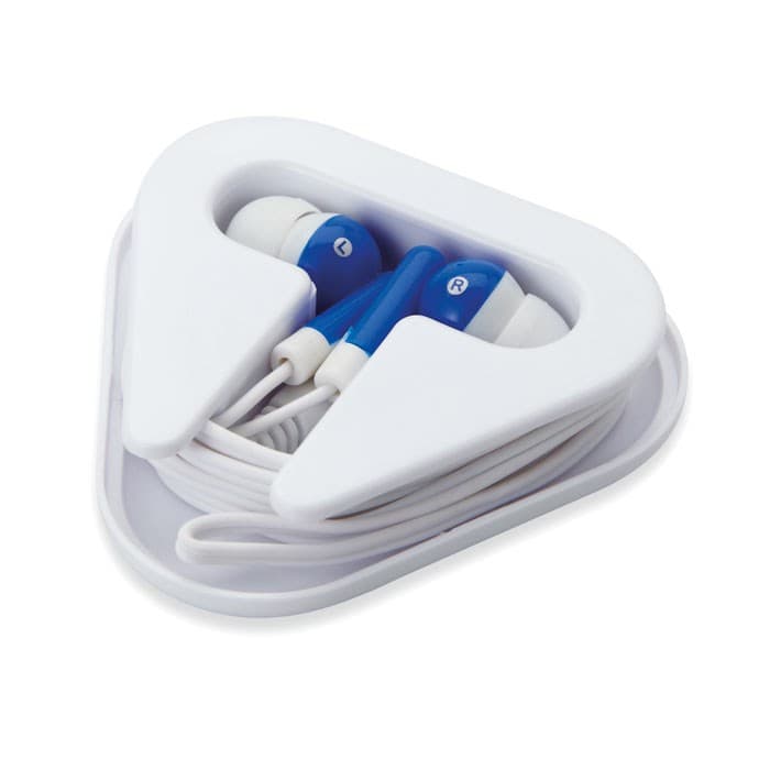 PVC oordopjes bedrukken, opgerold in een driehoekig PS doosje. Lengte kabel, 120 cm.