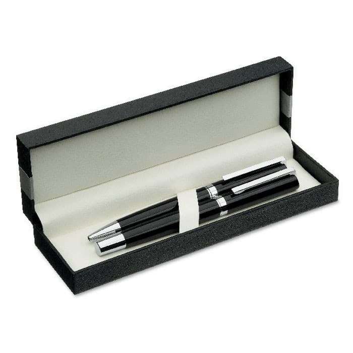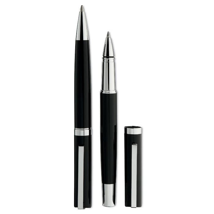Pennenset in een geschenkverpakking bestaande uit een balpen met draaimechanisme en een rollerpen. Blauwe inkt.
