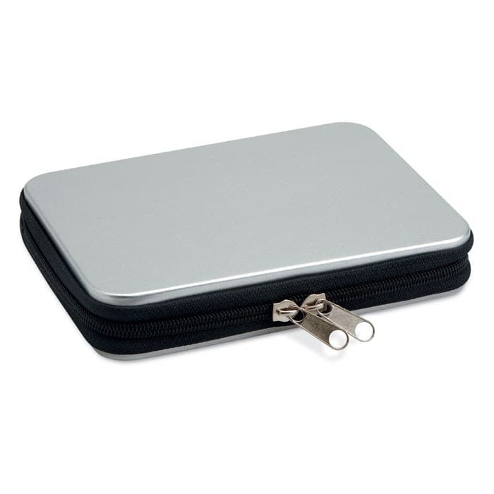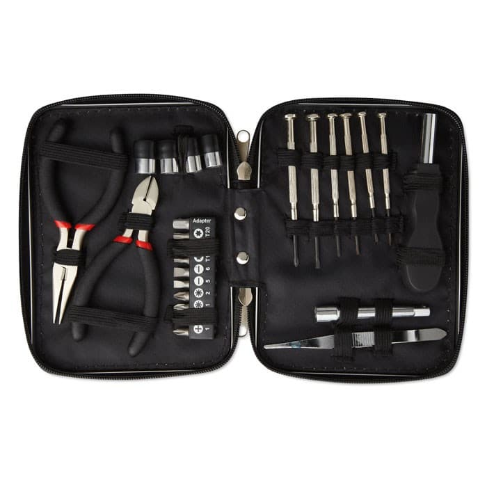 25-Delige gereedschapsset verpakt in een aluminium behuizing met 1 tang, 1 kniptang, 1 schroevendraaier bithouder, 1 verlengstuk, 10 bitjes, 1 pincet, 4 doppen en 6 precisie schroevendraaiers.