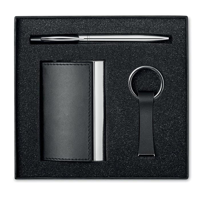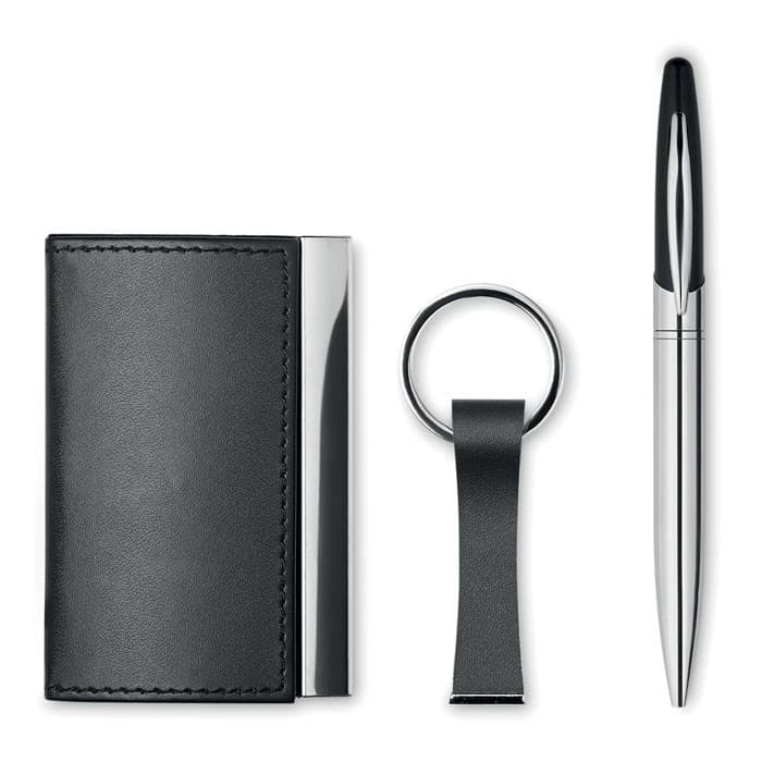 Zakelijke geschenkset met een metalen balpen met draaimechanisme, een sleutelhanger van metaal met PU en een visitekaarthouder. Verpakt in een doosje. Zwarte inkt.