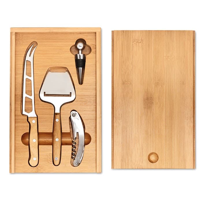 Bamboe kaas- en wijnset met een roestvrijstalen mes, kaas schilmesje, flessenopener en wijnstop. Gepresenteerd in een bamboe doosje. Bamboe is een natuurlijk product, de kleur per artikel kan verschillen.