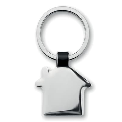 Metalen huisvormige sleutelhanger. Glimmende afwerking.