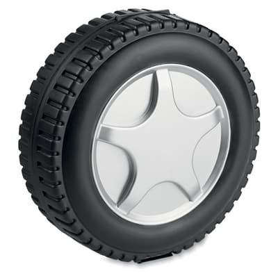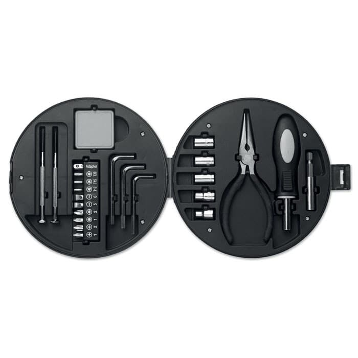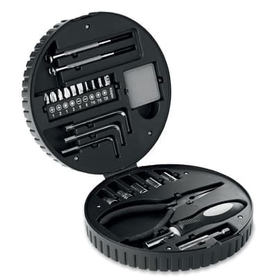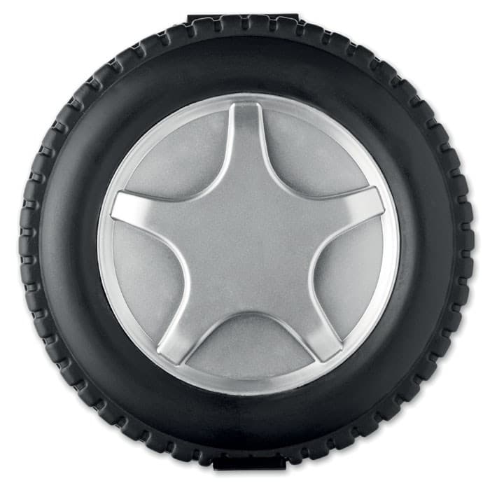 25-Delige gereedschapset in doosje in de vorm van een autoband. Inclusief 1 verlengstuk, 1 schroevendraaier met verwisselbare koppen, 1 tang, 5 dopsleutels, 3 inbussleutel, 10 bits sets, 2 precisie schroevendraaiers en 1 rolbandmaat.