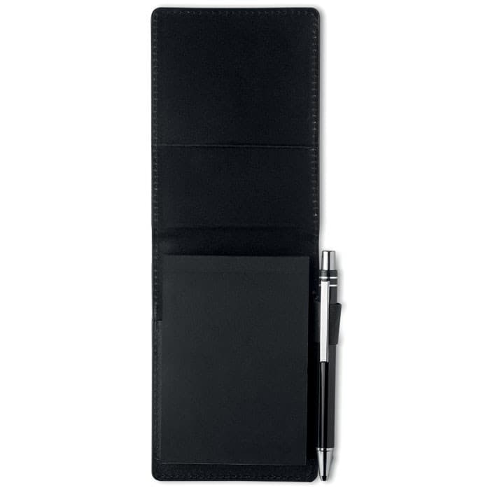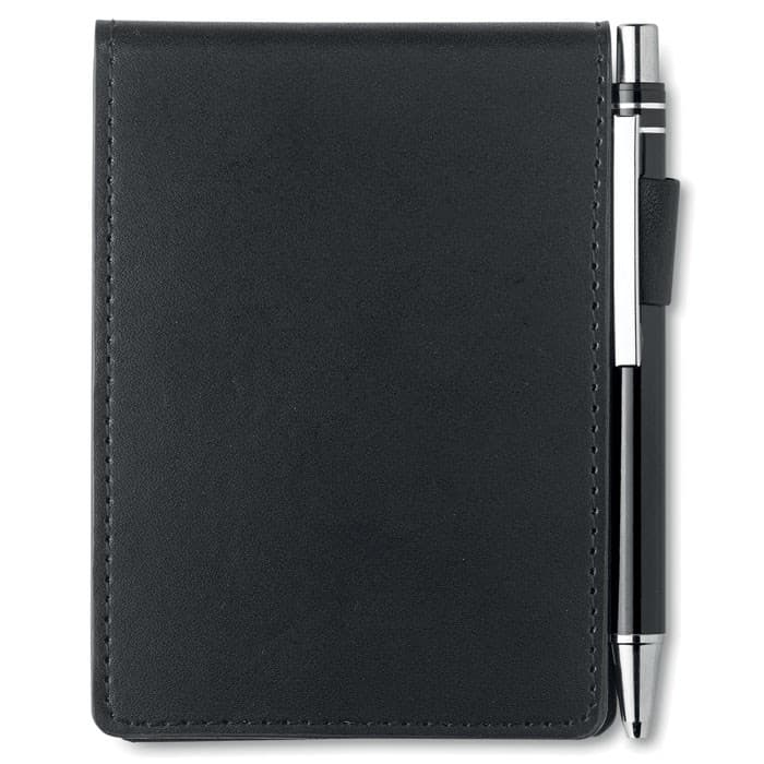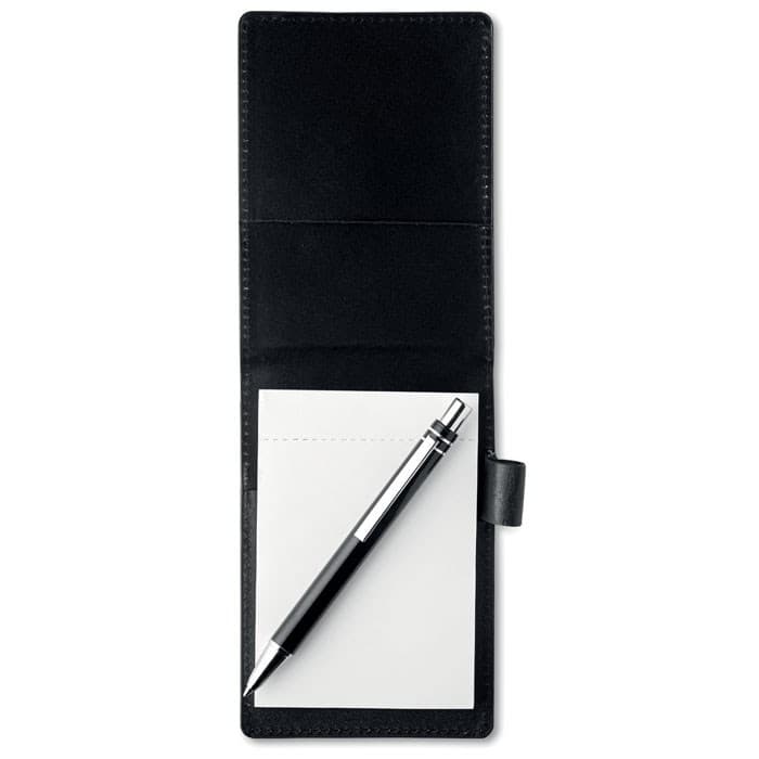 Schrijfblokje met 60 vel blanco A7 papier (70 grams) met balpen (blauwe inkt) in PU etui.