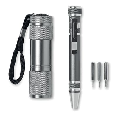 Penvormige aluminium multitool met 9 LED lampjes en zilverkleurige clip. Bevat 3 kruiskop- en 3 platte schroevendraaiers. Exclusief 3x AAA batterijen. Perfect om multitools te bedrukken.