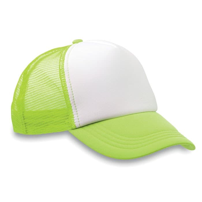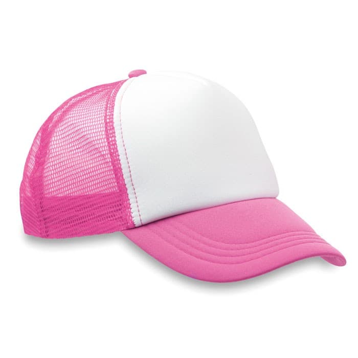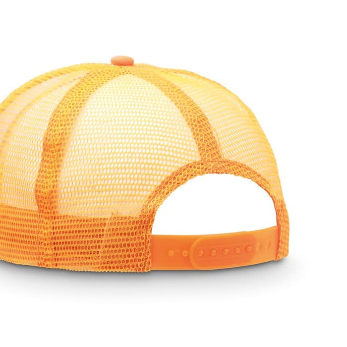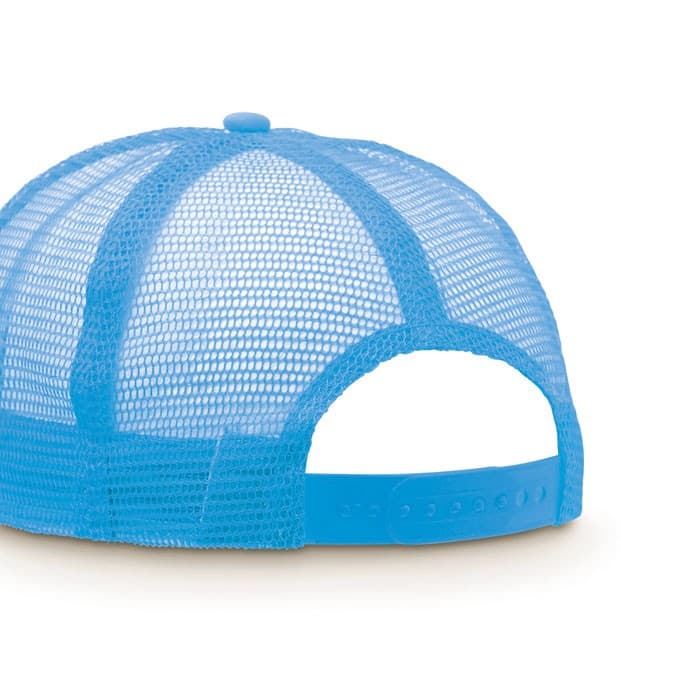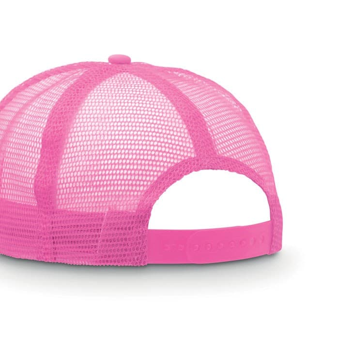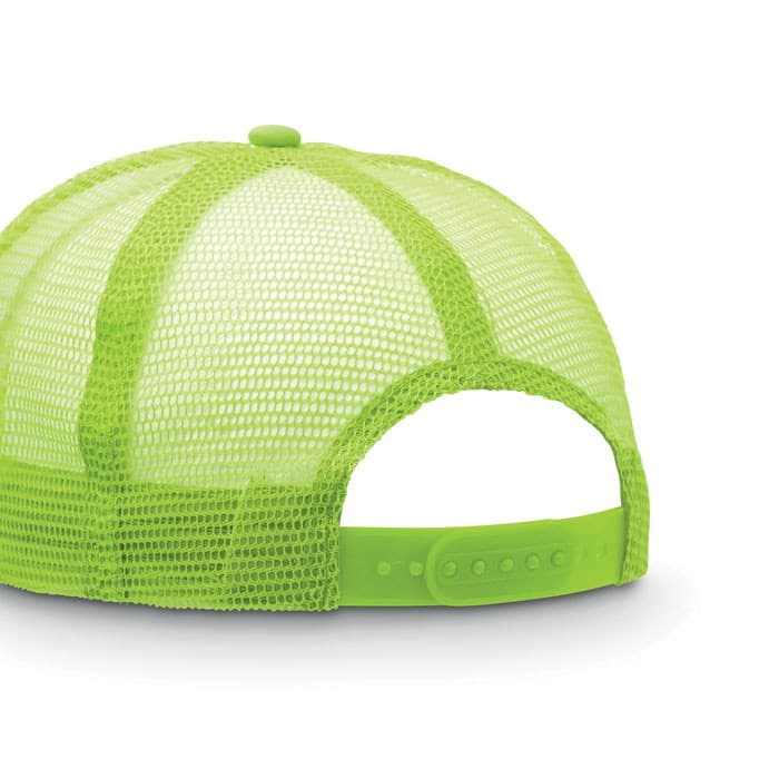 De cap bestaat uit vijf panelen, waarbij de voorzijde is voorzien van schuimrug voor extra stevigheid, en de overige panelen van ademende mesh in kleur. Dankzij de verstelbare sluiting past de cap comfortabel op vrijwel elk hoofd.