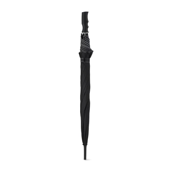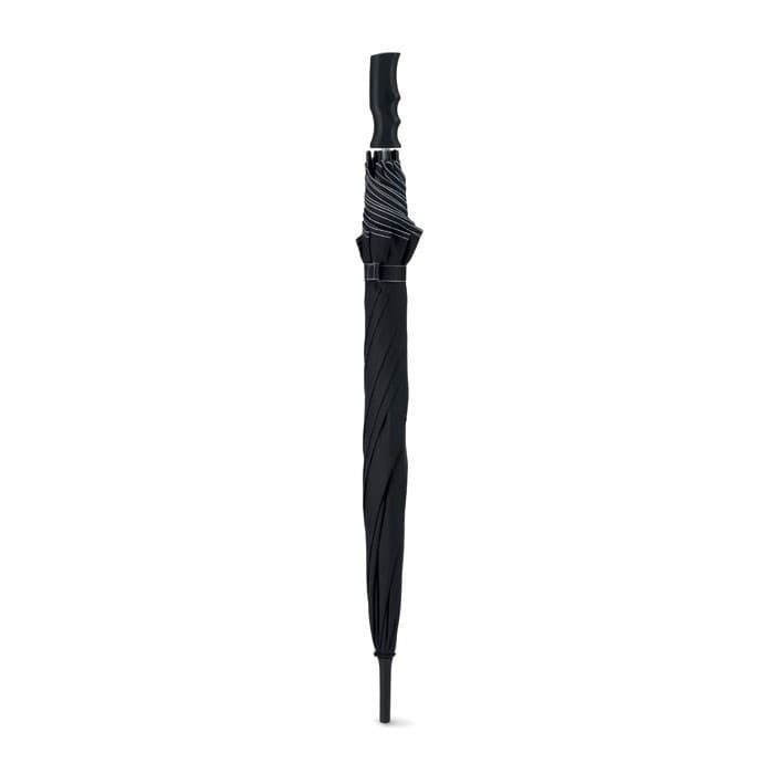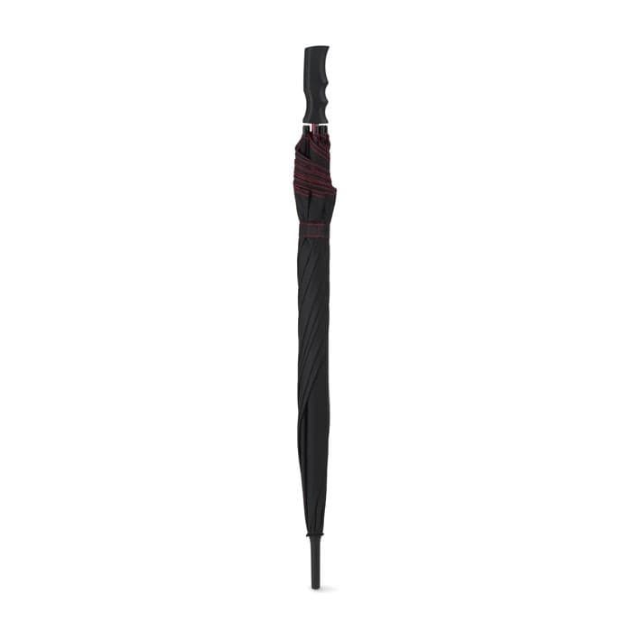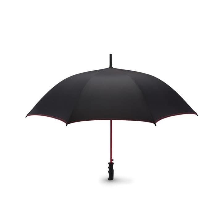 23 Inch windbestendige paraplu van pongee. 190T polyester. Glasvezel frame, gekleurde baleinen en zwart kunststof uiteinde. Panelen in zwart en bijpassend gekleurde stiksels. Zwart kunststof handvat. Opent automatisch en sluit handmatig.