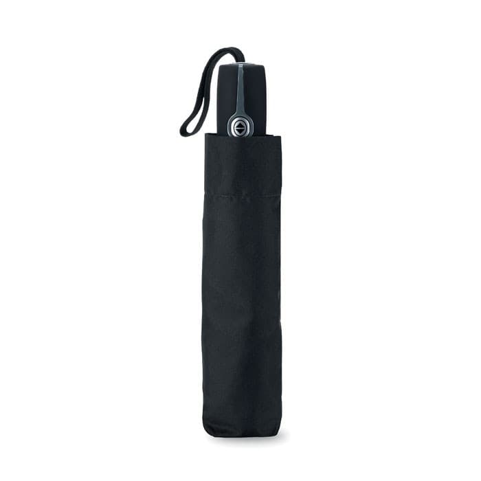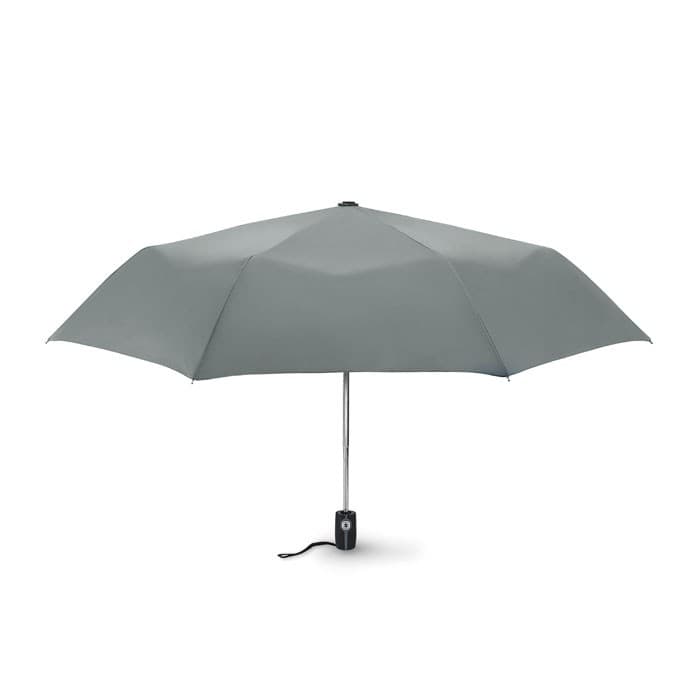 Luxe 21 inch stormparaplu van 190T polyester en pongee. Zwart metalen steel. Frame en baleinen van glasvezel en chroom metalen top. Rubberen ABS handgreep met grijze knop. In 3 delen opvouwbaar. Inclusief bijpassend hoesje. Opent en sluit automatisch.