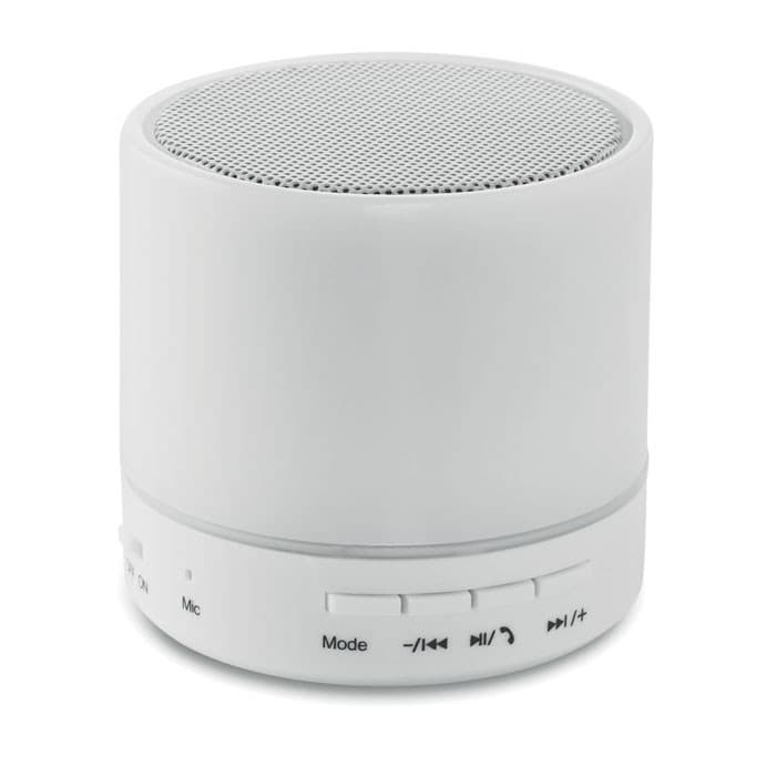 2.1 draadloze luidspreker van ABS met sfeerverlichting en LED indicatie. Inclusief 1 oplaadbare lithium 450 mAh batterij. Voorzien van een SD poort en een AUX/USB-kabel. Handsfree belfunctie. Output data: 3W, 4 Ohm.