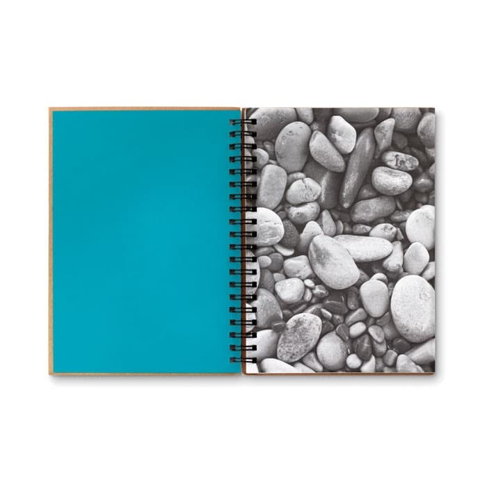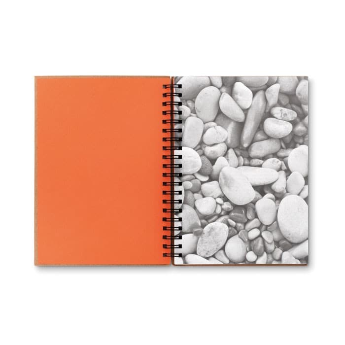 Notitieboek met ringband, gevuld met 140 pagina's (70 vellen) steenpapier en een cover van gerecycled karton. Steenpapier bestaat voor 80% uit calciumcarbonaat en 20% uit HDPE-polyethyleen, waarbij het calciumcarbonaat afkomstig is uit kalksteengroeven en het polyethyleen op basis van biopolymeren wordt geproduceerd. Perfect voor het bedrukken van notitieboekjes in kleine oplage, ideaal als duurzaam en innovatief relatiegeschenk.