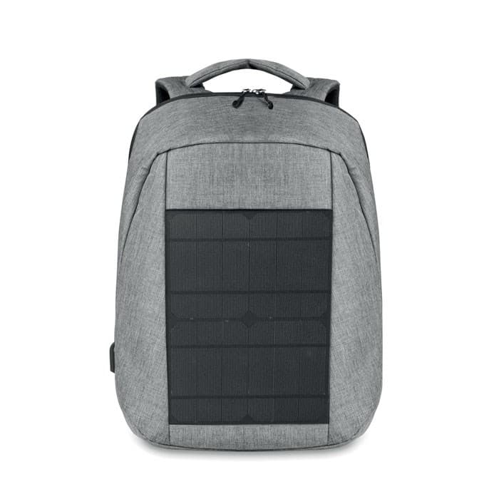 Duo-tone 600D polyester rugzak met solarpaneel, USB poort en kabel. Oplaadtijd telefoon ongeveer 5 - 6 uur bij direct zonlicht. Twee hoofdvakken, diverse kleinere vakjes. 13 Inch laptopvak, gevoerde achterzijde en schouderbanden. Vak voor tablet.