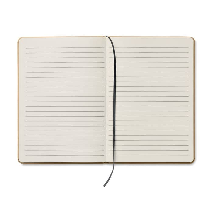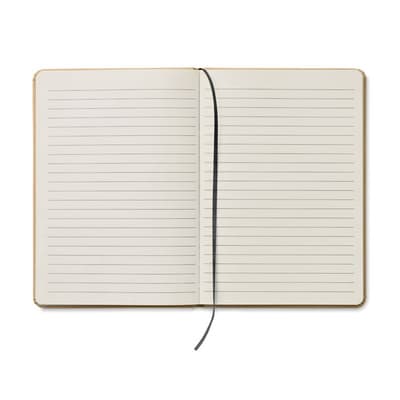 A5 notitieboek van gerecycled karton met 160 pagina's (80 vellen) gelinieerd papier, gekleurd sluitelastiek en leeslint.