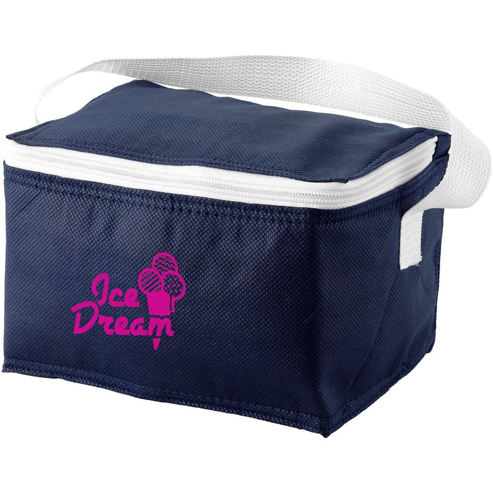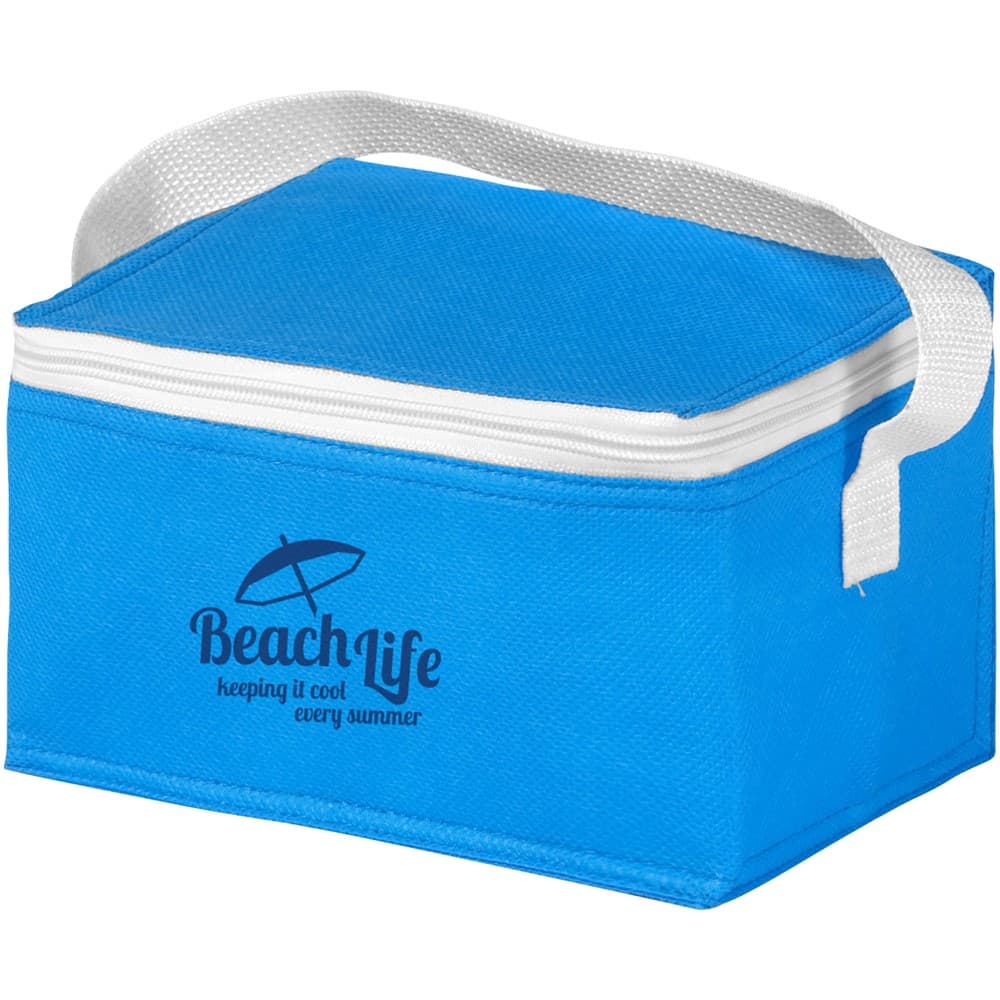 Polyester koeltas met draagriem. Compact en geschikt voor zes blikjes van 330 ml. Afsluitbaar door m