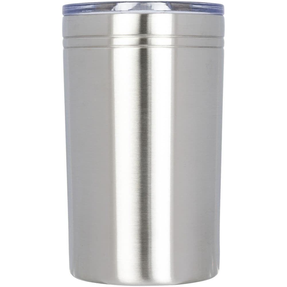 Dubbelwandige constructie, vacuüm geïsoleerd. Doorzichtige drukdeksel met een schuifsluiting. Te gebruiken als beker of drankisolator. Volume 330 ml.