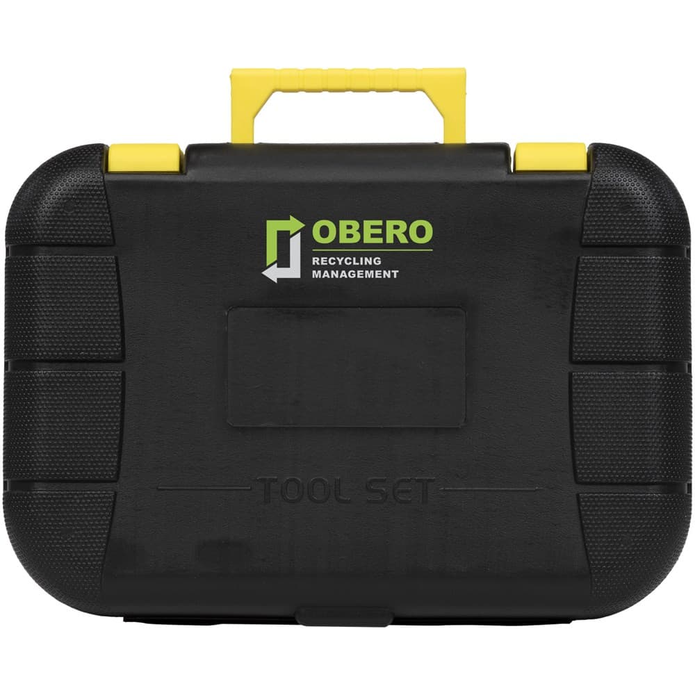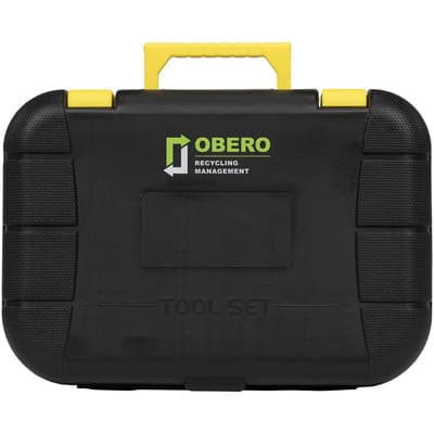 Gereedschapskoffer met klikmechanisme en opvouwbare draaggreep bevat klauwhamer, 4 mm platte schroevendraaier, combinatietang, snijmes met vergrendelingsfunctie, inbussleutelhouder met 5 inbussleutels (2-6 mm) met een standaard en kogeluiteinden. Meetlint van 3 meter met vergrendelingssysteem, schroevendraaier voor spanningstester, tape en 4 precisie-schroevendraaiers.