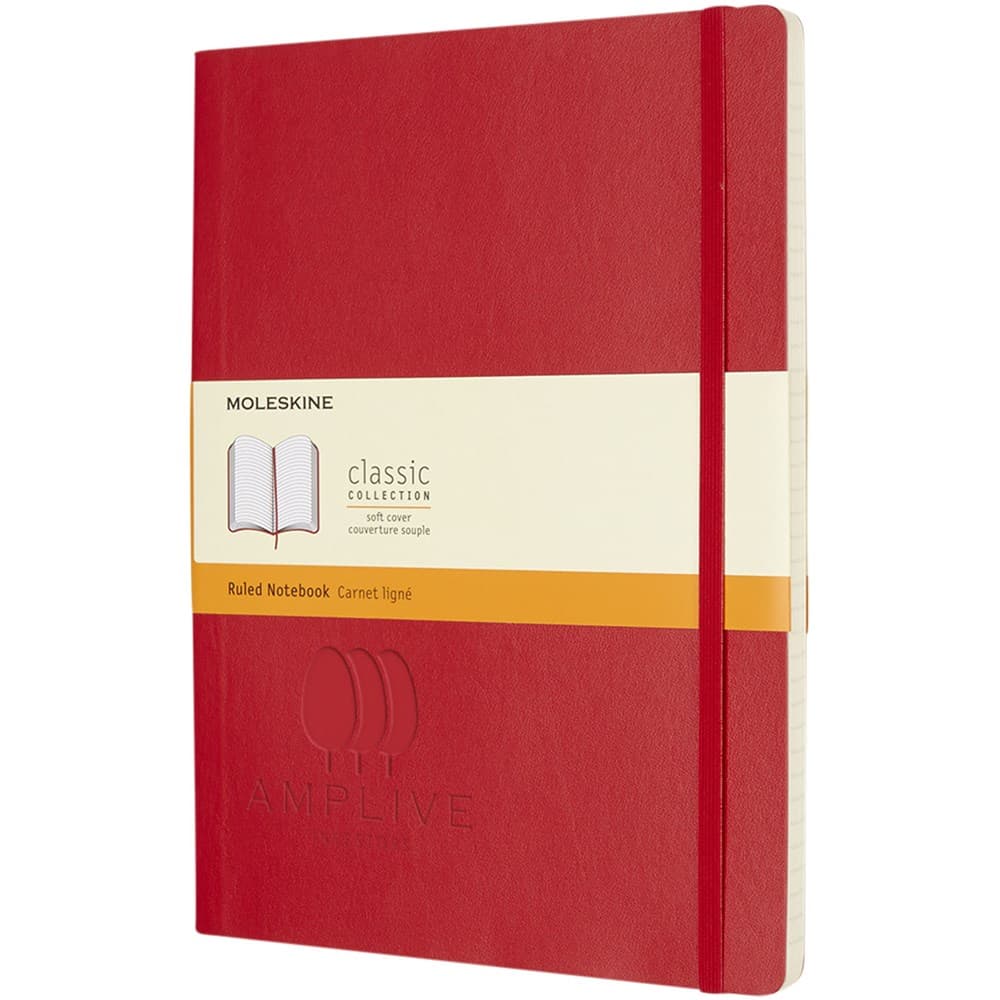 Het Moleskine Classic XL (19 x 25 cm) softcover notitieboek is verkrijgbaar in diverse stijlvolle, levendige kleuren. Het notitieboek heeft een kartonnen zachte omslag met afgeronde hoeken, zuurvrij papier, een bladwijzer en een elastische sluiting. De eerste pagina biedt ruimte voor persoonsgegevens en het noteren van een beloning die de eerlijke vinder ‘in geval van verlies’ ontvangt. Aan de achteromslag bevindt zich aan uitbreidbaar binnenvak met daarin de geschiedenis van Moleskine. Dit vak kan worden gebruikt voor losse papieren en notities. Bevat 192 ivoorkleurige gelinieerde pagina's.