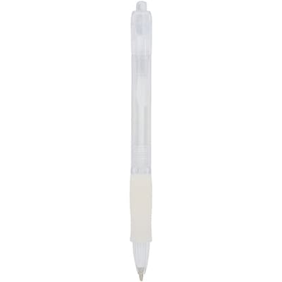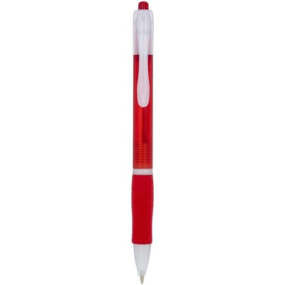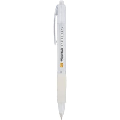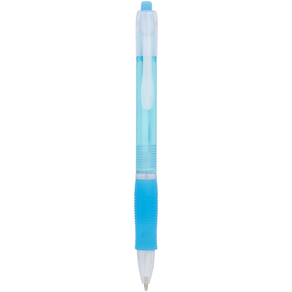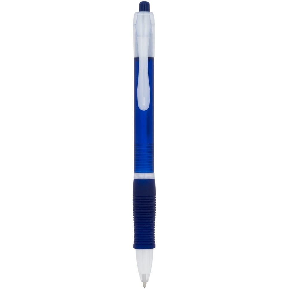 Kleurrijke klik balpen met bijpassende kleur rubberen grip. Blauwschrijvend.