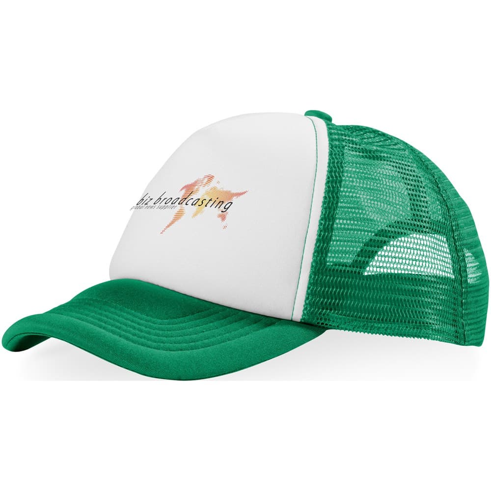 De vijfdelige constructie (5 panels) zorgt voor een mooie pasvorm, terwijl de stevige foam-voorzijde zijn vorm behoudt en uitstekend geschikt is voor een duidelijke opdruk. De mesh-panelen aan de achterkant bieden extra ventilatie, wat deze cap geliefd maakt bij sportevenementen, zomerse acties en outdoor campagnes.