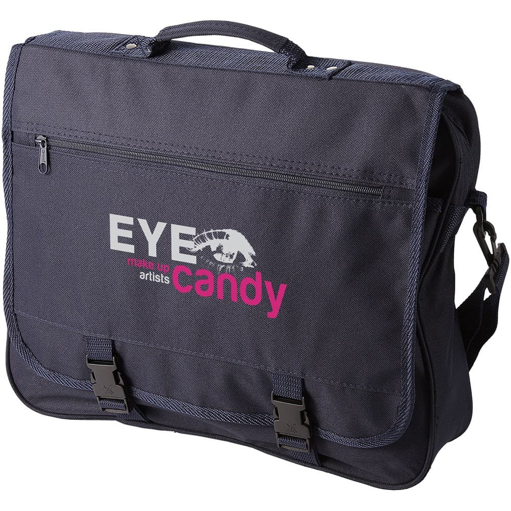 Conferentietas met verstelbare schouderband, gespsluiting, ritsvak in de flap, hoofdvak met ritssluiting en diverse open vakjes onder de flap.