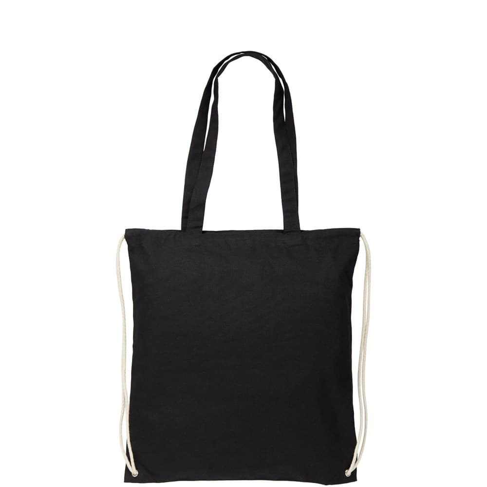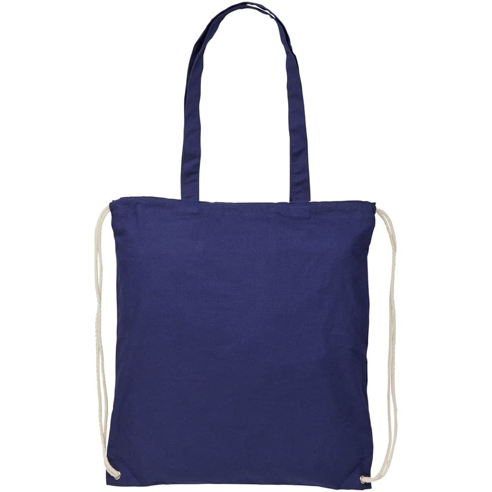 Multifunctionele katoenen tas met lange handgrepen en trekkoord die als schoudertas of rugzak kan worden gedragen. Groot hoofdvak met trekkoordsluiting. Voorzien van twee uitklapbare handgrepen met een lengte van 31 cm. Capaciteit: 1,5 l, weerstand tot 5 kg gewicht.