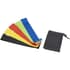 Set van 5 duurzame weerstandsbanden (60x5 cm.) met verschillende sterkten. Elk band biedt een soepele en consistente stretch. Door dat de banden extra weerstand bieden gaat de intensiviteit van de oefeningen omhoog. Te gebruiken in allerlei sporten. Inclusief opbergtasje. Afmeting en weerstand voor de verschillende banden: groen 0,35 mm/4,5 kg/10 lbs, blauw 0,50 mm/5,4 kg/12 lbs, geel 0,7 mm/7,2 kg/16 lbs, rood 0,9 mm/8,1 kg/18 lbs, zwart 1,1 mm/9 kg/20 lbs. Ideaal voor fitness bedrukken!