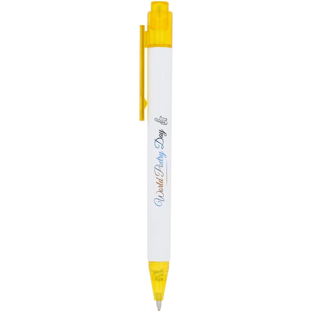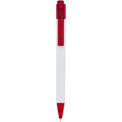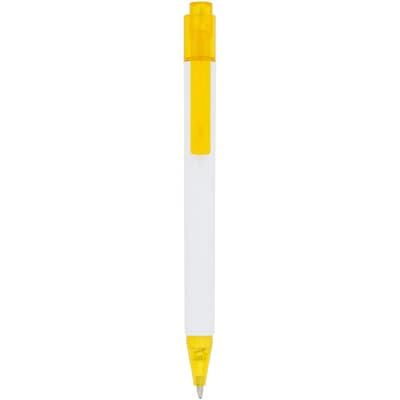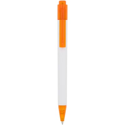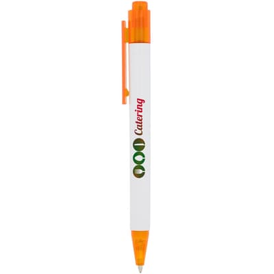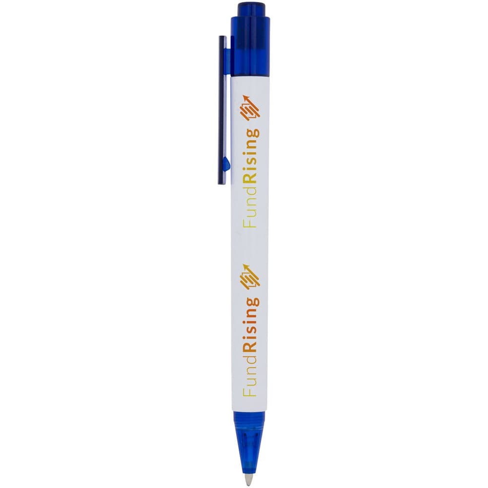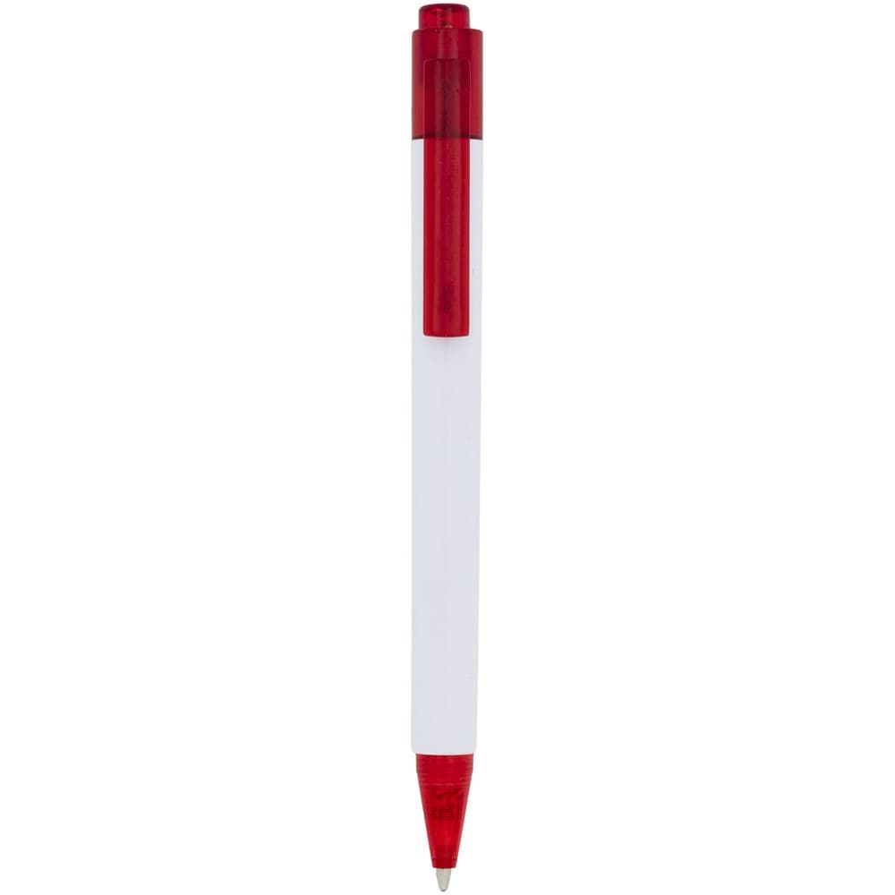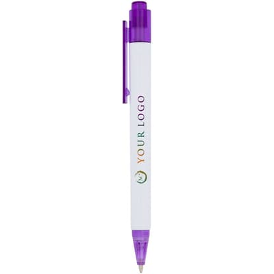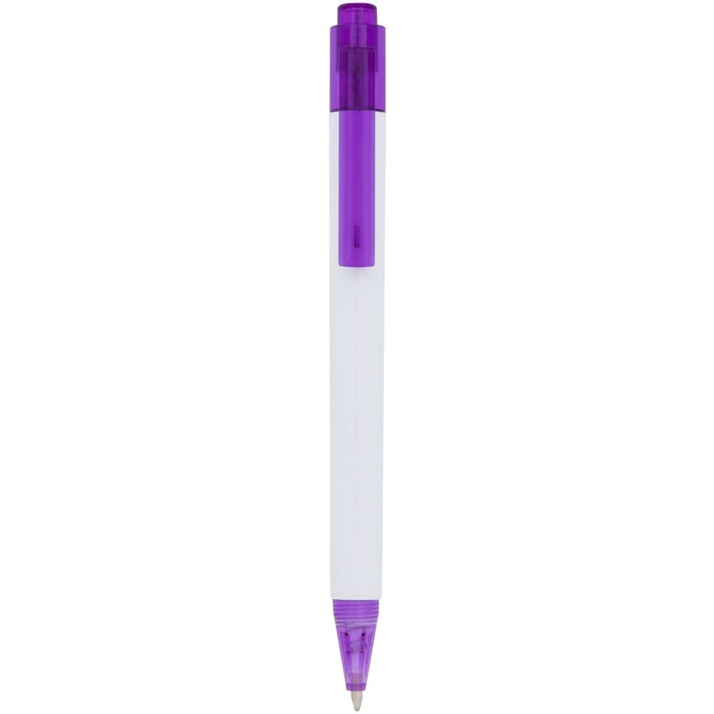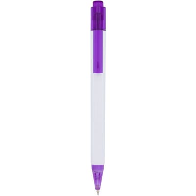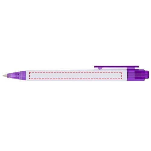De Calypso-balpen heeft een gladde, witte greep met een doorschijnende gekleurde punt en clip.