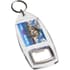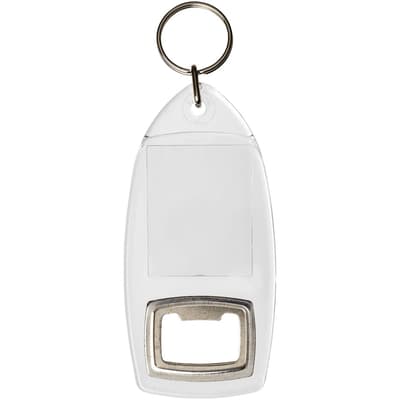 Doorzichtige R1 sleutelhanger met flesopener en metalen sleutelring. De metalen lusring biedt een vlak profiel dat ideaal is voor de post. Afmetingen van het te bedrukken inzetstuk: 4,0 cm x 3,2 cm.