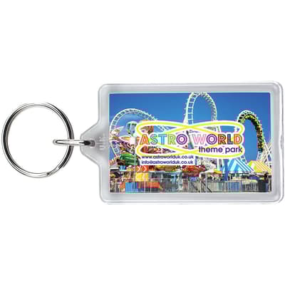 Doorzichtige rechthoekige G1 sleutelhanger met metalen sleutelring, heropenbaar met een muntje. Het vlakke profiel van de metalen lusring maakt het ideaal voor verzending per post. Geschikt voor sleutelhangers bedrukken met een inzetstuk van 5,0 cm x 3,0 cm.