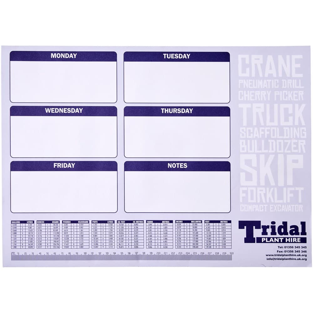 Wit A2 Desk-Mate® bureauonderlegger. Standaardmodel Inclusief 50 vel 80 g/m2 papier. Full colour bedrukking beschikbaar op elk vel. Beschikbaar in 2 formaten (25/50 vellen).