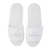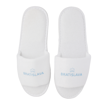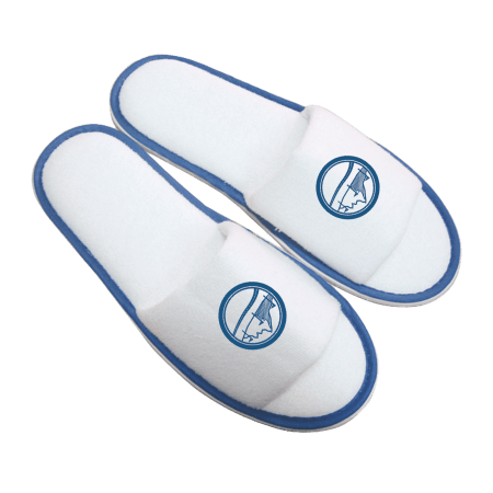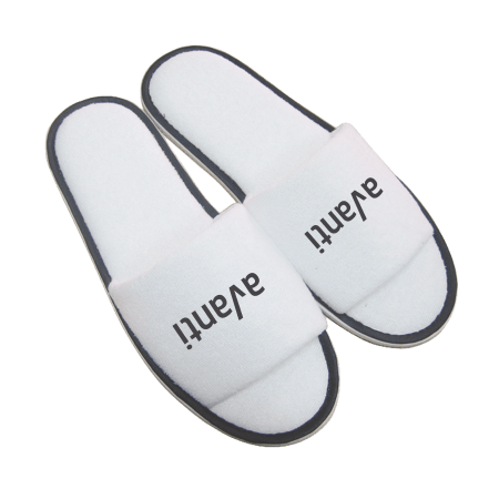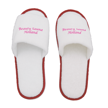 Paar slippers, open teen, kleur wit met gekleurde bies, één maat, badstoffen bovenkant en met antislip zool. Ideaal voor slippers bedrukken.