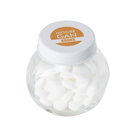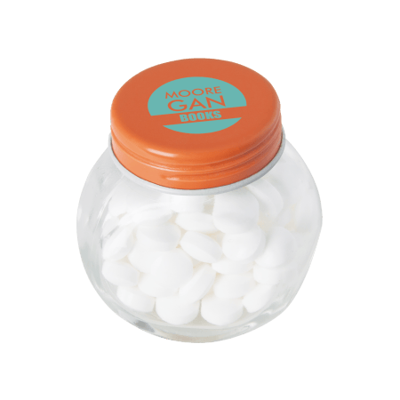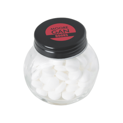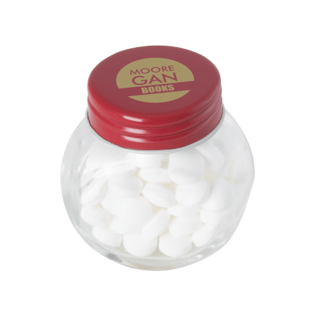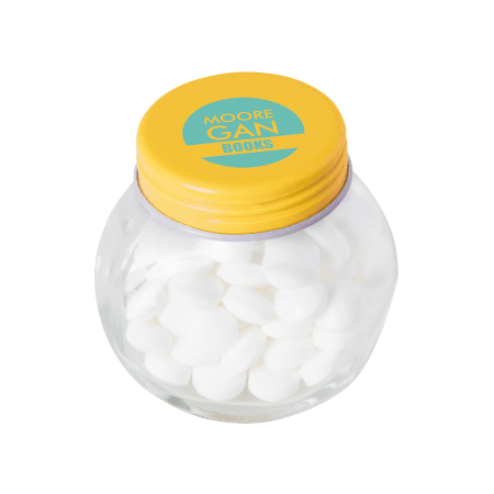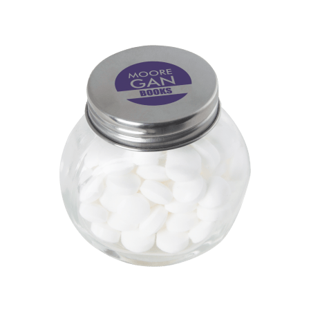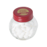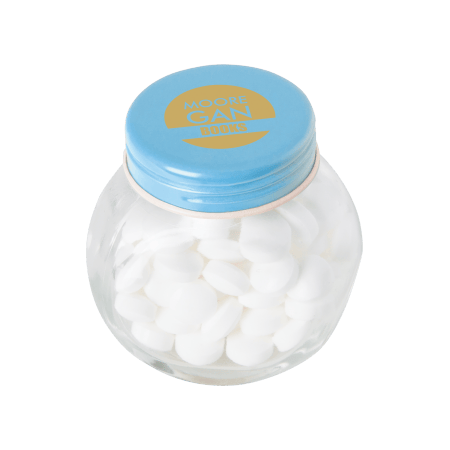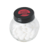 Kleine glazen pot gevuld met ca. 40 gr. mints gekleurd deksel, 53x35x55 mm, met bedrukking op dekseltje.
